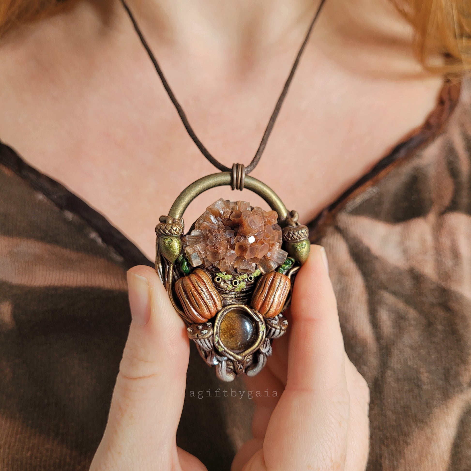 This item is sculpted with polymer clay around an oxyda plated metal ring in a bronze finish, hand painted and glazed with varnish. Strung on clasped brown cotton cord.