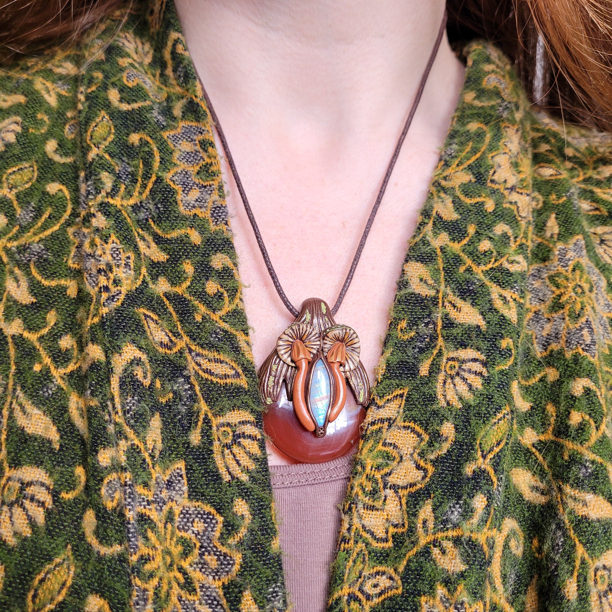 Mushroom & Moss Prayer Pebble Talisman ~ Rainbow Moonstone & Carnelian